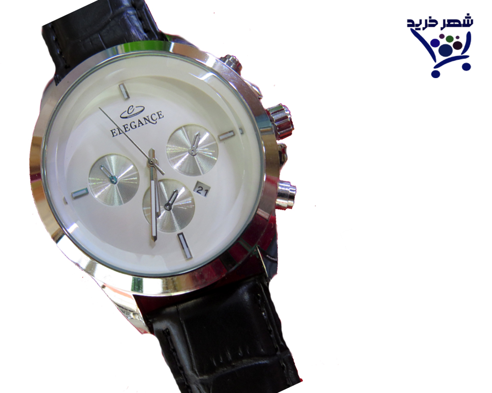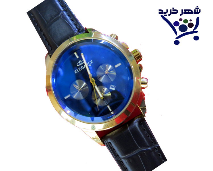 ساعت مچی مردانه دسته چرم برند الگانس صفحه آبی بافریم طلایی وصفحه سفید با فریم نقره ای کیفیت ساخت خوب